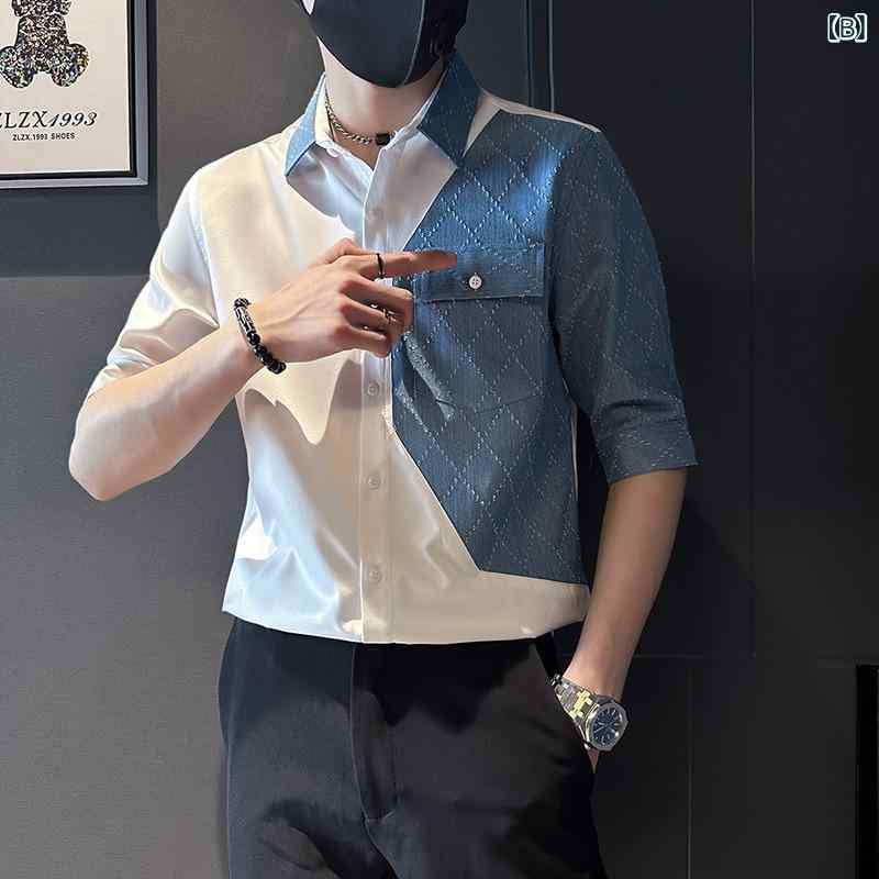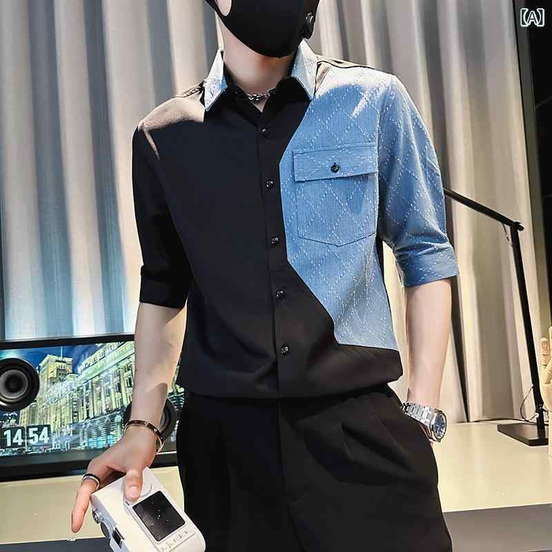 シャツ メンズ 半袖 デニム 切り替え 5分袖 トップス スリム 薄手 スタイリッシュ モノトーン カジュアル 春秋
