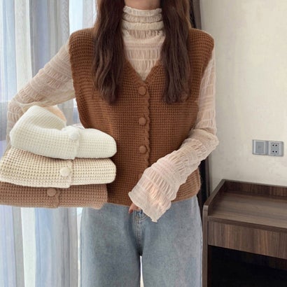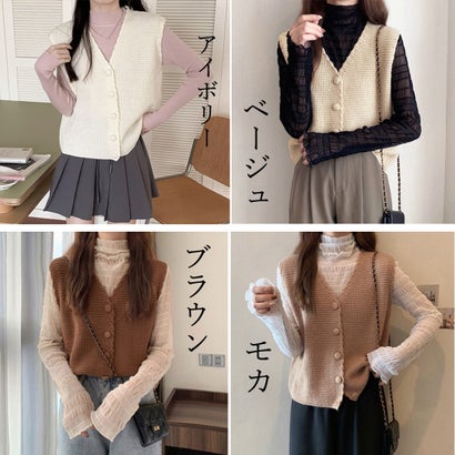 ニットトップス 前開き 韓国ファッション ボタン付き 重ね着 コーディネート かわいい カジュアル レイヤード 洋服チョッキ 春秋冬 着回し 通勤通学 ノースリーブニット大きく開いたVネックが顔周りをスッキリ見せてくれますボタンを開けてジレの様にご着用頂いても可愛いですブラウスやワンピースとレイヤードするコーデがイチオシです素材:ポリエステル75%+アクリル25%カラー:アイボリー/ベージュ/モカ/ブラウンサイズ:ワンサイズ着丈:約51cm 肩幅:約34cm 身幅:約42cm 胸囲:約84-110cm裏地:なし伸縮性:あり透け感:淡色のみややあり
