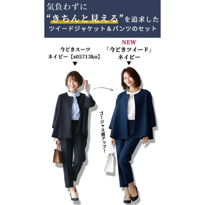 『今どきツイード』脱いつものスーツEhre styleオリジナル大ヒット誇るスーツ部門NO.1獲得の「今どきスーツ」から上品クラシカルなツイードスーツVer.が登場!気負わずにきちんと見えるを追求したツイードジャケット&パンツのセット卒業式や入学式などオケージョンに欠かせない!華やかさとクラシック気分が一気に上がるデザイン!さらに今回!ツイード大好きさんはもちろんツイード苦手さんも必見!ツイード素材は、どこに行ってもきちんとした格好に見えるので重宝しやすく人気のアイテムの1つ◎ただ・・・着こなし方・デザインによってはおばさんっぽく見えてしまって苦手な方も・・・↓そんなお悩み解決します!”昔のツイードとはココが違う”『今どきツイード』生地金糸など入れず同色のみで仕上げた生地!着る人を選ばない落ち着きがある柔らかな風合いと上品さで仕上げました!”ゴテゴテ・盛り盛りしない!”『今どきツイード』デザイン欽ボタンや肩パットなどの派手な装飾は全て省いたデザインシンプルだからブラウスやアクセサリーでじぶんらしい着こなしをたくさん楽しめるカタチに。
