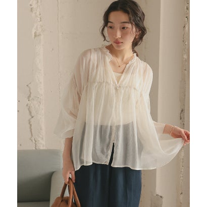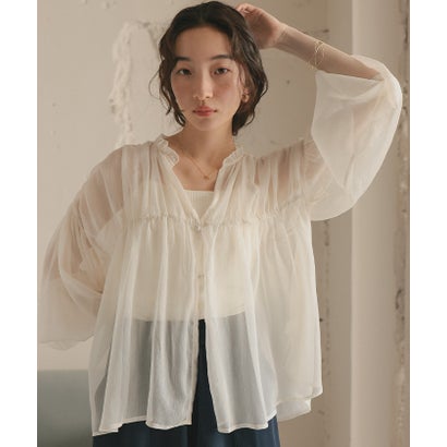 ・表面感のあるシアー素材・ブラウスとしてはもちろん、羽織りとしても使える・たっぷり入ったギャザーが女の子らしく可愛いデザイン・胸元も抜け感があり、少し後ろに抜いて着るのもおすすめです