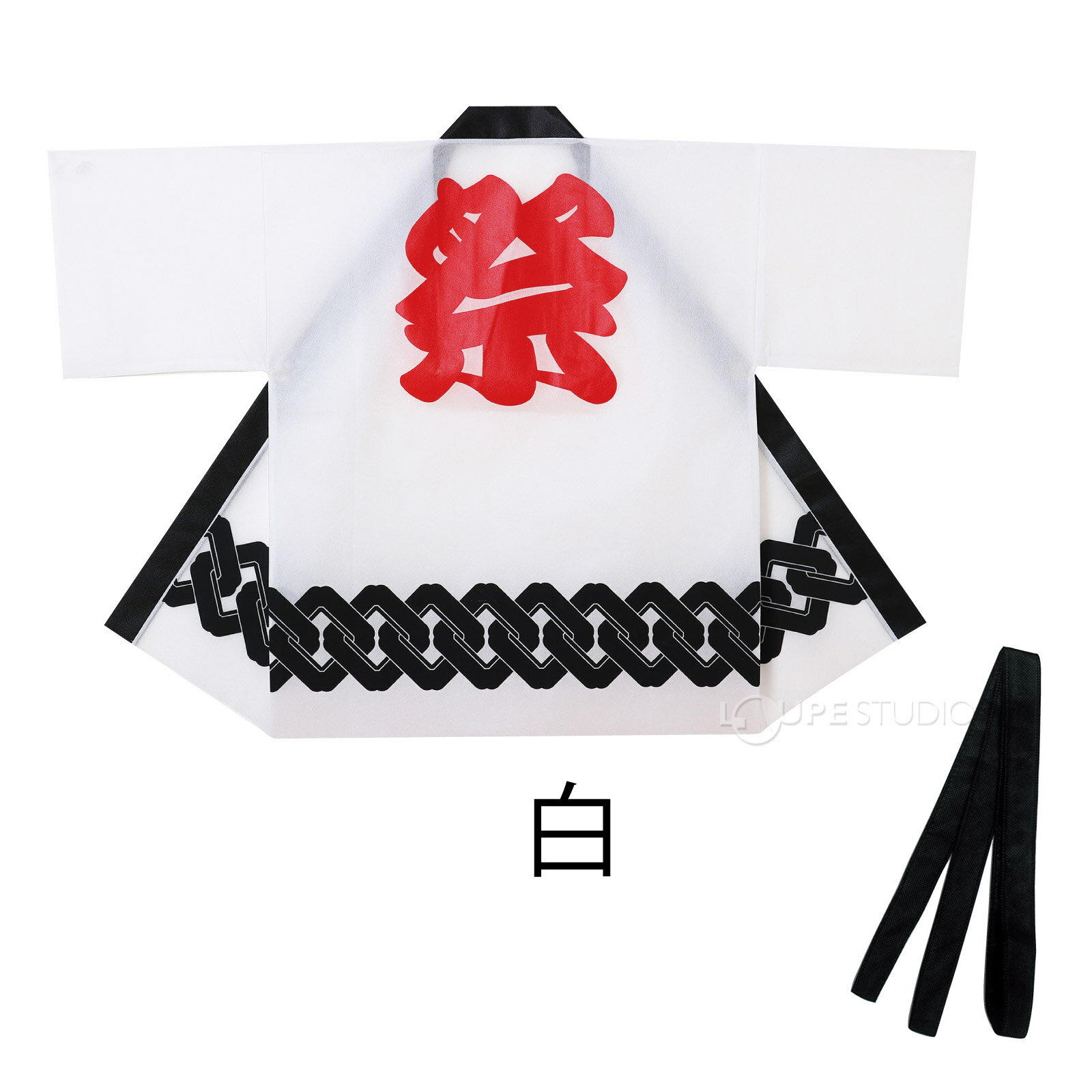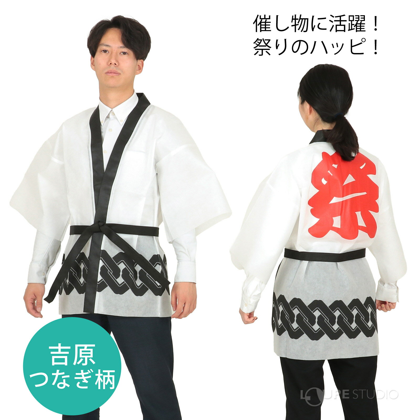 背中には迫力満点の「祭」文字プリントが施され、お祭りはもちろん、企業イベントや催し物にぴったりのアイテムです。