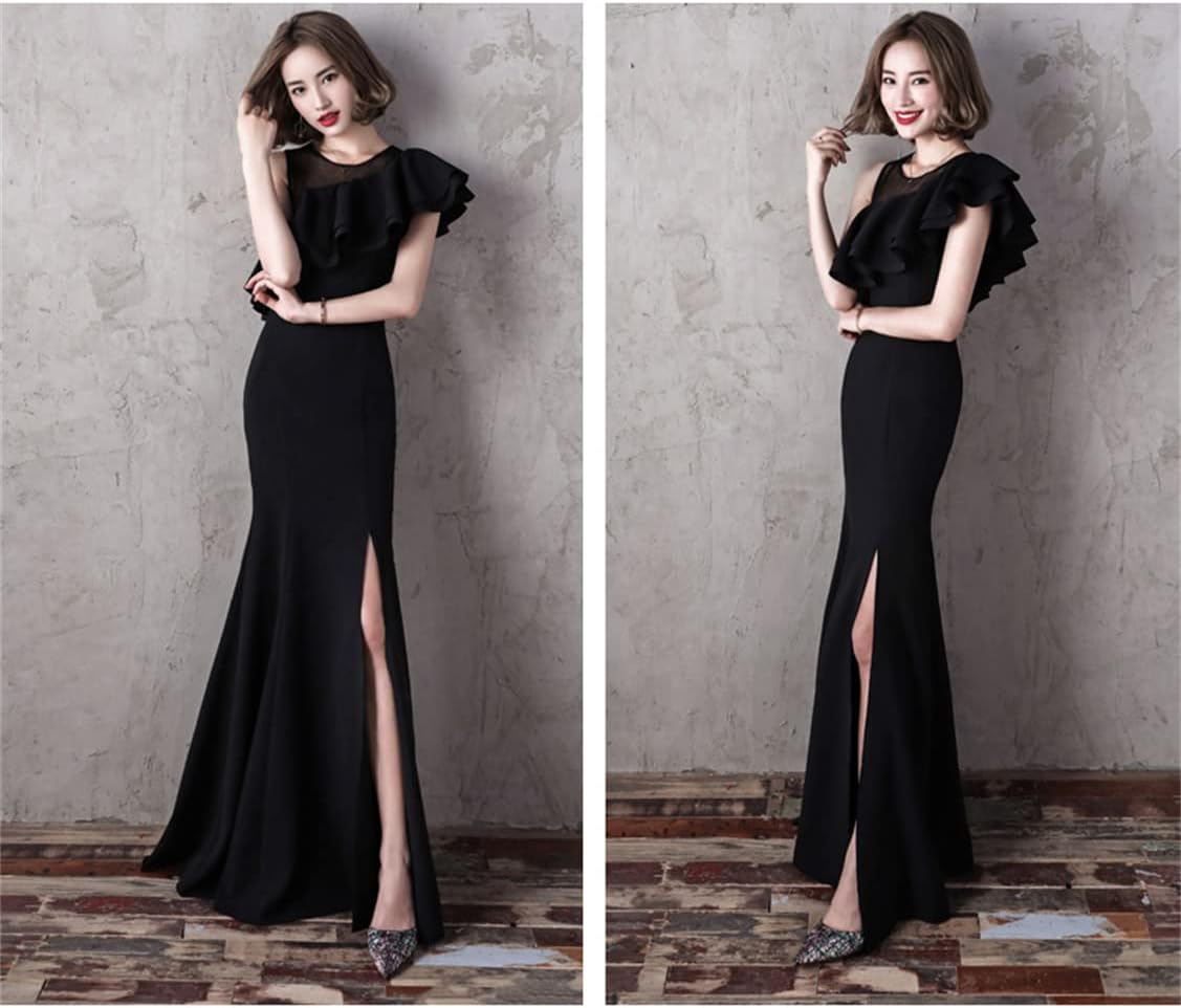 タイトなハイウエストデザインでバスト部が強調され、ウエストはほっそりと、左脚に入ったロングスリットが脚長効果とセクシーさを演出。
