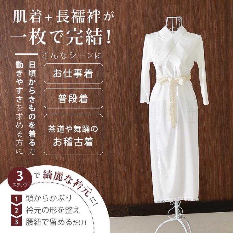 肌着と長襦袢の2役を1枚に! 頭からすっぽりかぶって着られるTシャツワンピースに半衿が付いているので、この一枚で肌着と長襦袢の役割を果たします。
