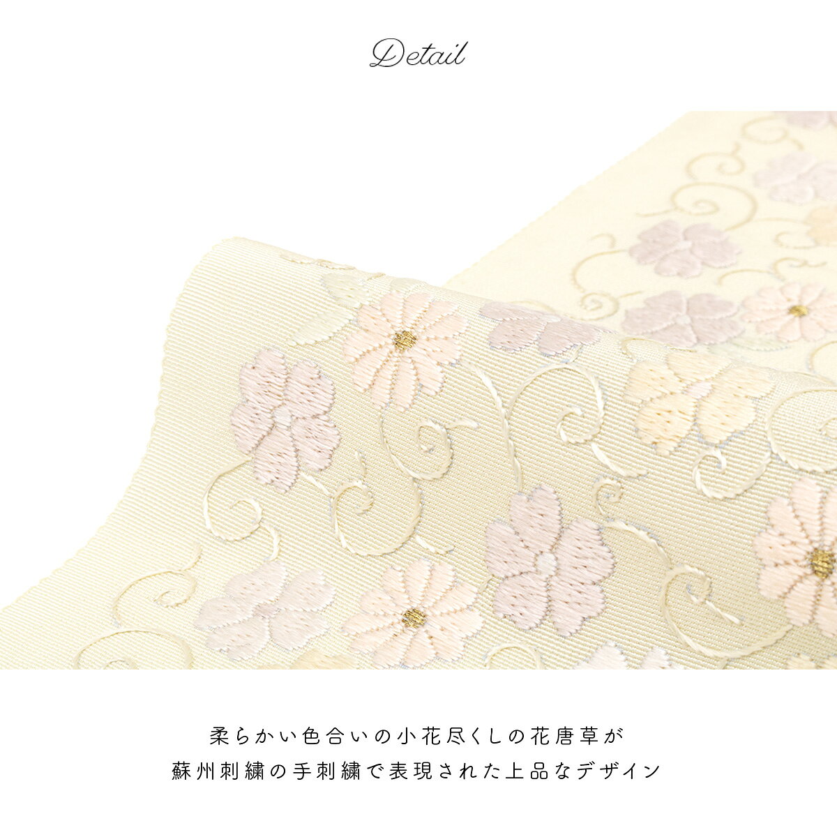 柔らかい色合いの小花づくしの花唐草が蘇州刺繍の手刺繍で表現された上品な柄行きです。