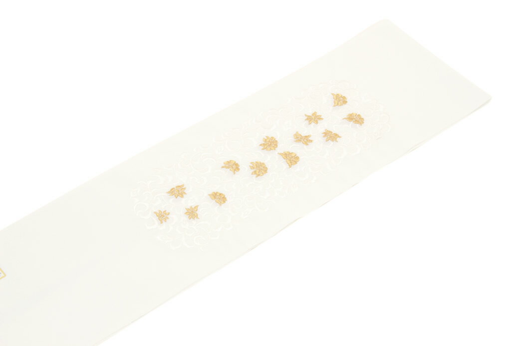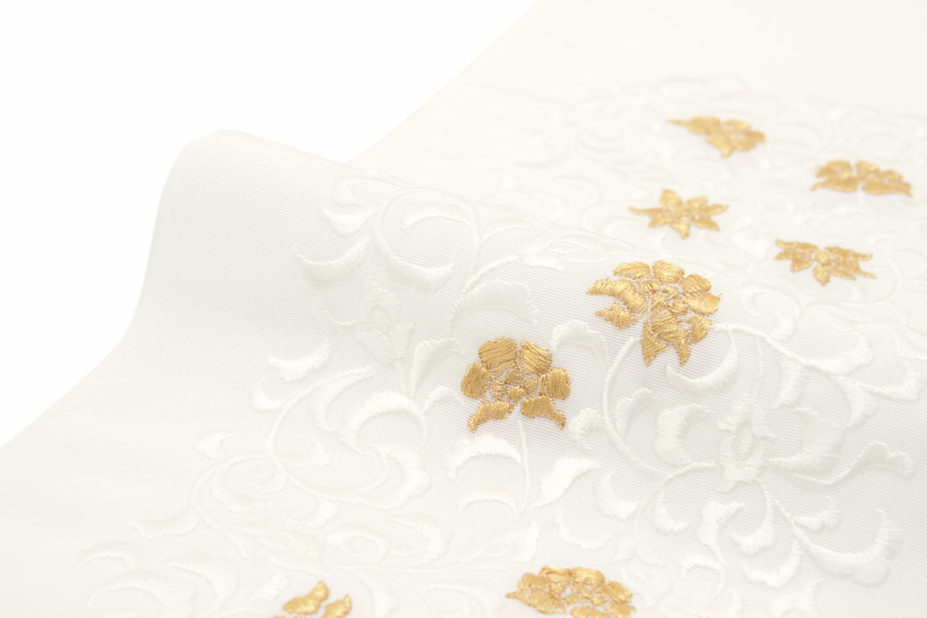 金糸でかたどった花びらを軸に牡丹唐草が豪華に刺繍されている上品な柄ゆきです。