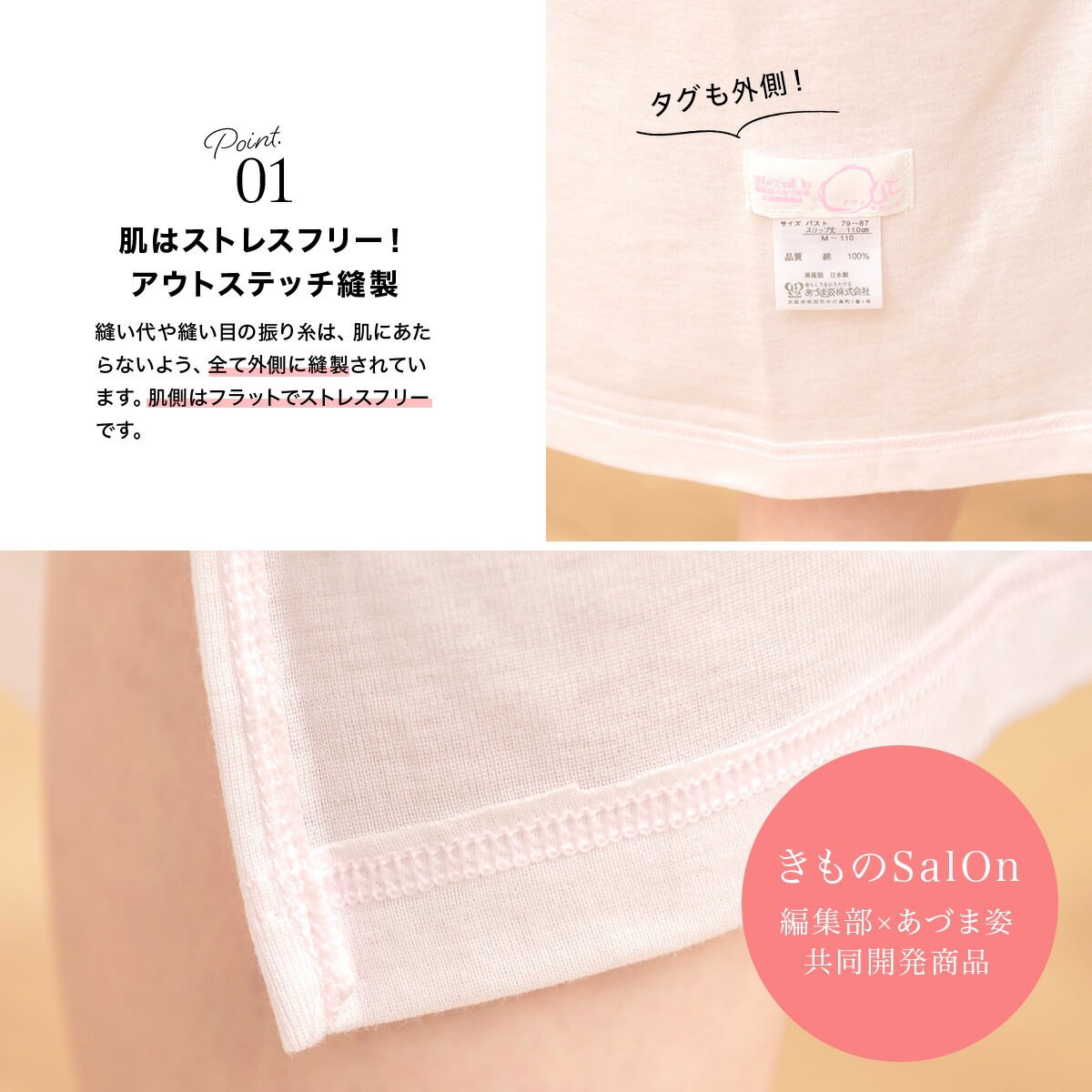サイズ表size.対応バストスリップ丈S約72~80cm約100cmM約79~87cm約110cmL約86~94cm約120cm「アウトステッチ製法」で肌に優しいスリップきものSalon編集部と着付け小物の人気メーカーあづま姿の共同開発のスリップです。