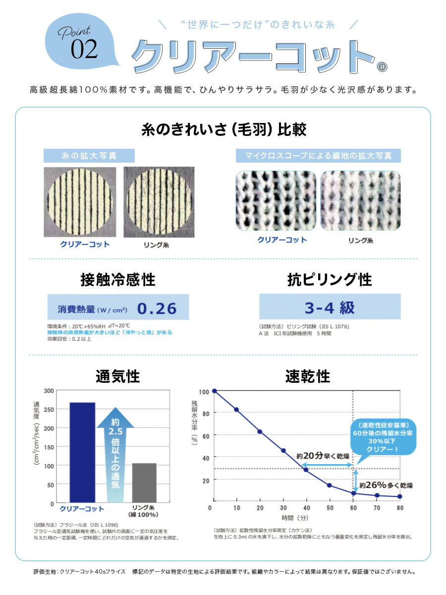 光沢感がある素材は、糸の毛羽を極限まで抑える紡績技術により「接触冷感」「吸水速乾」「通気性」「抗ピリング」を実現した、ひんやりさらさらな肌触りが特長の生地「クリアーコット」を使用しています。
