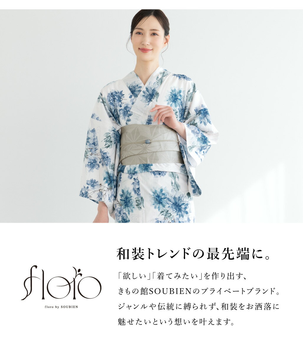 『floro by SOUBIEN』(フローロ)は、移りゆく和装トレンドの最先端を常に追い求め、「欲しい」「着てみたい」を作り出す、きもの館SOUBIENのプライベートブランドです。
