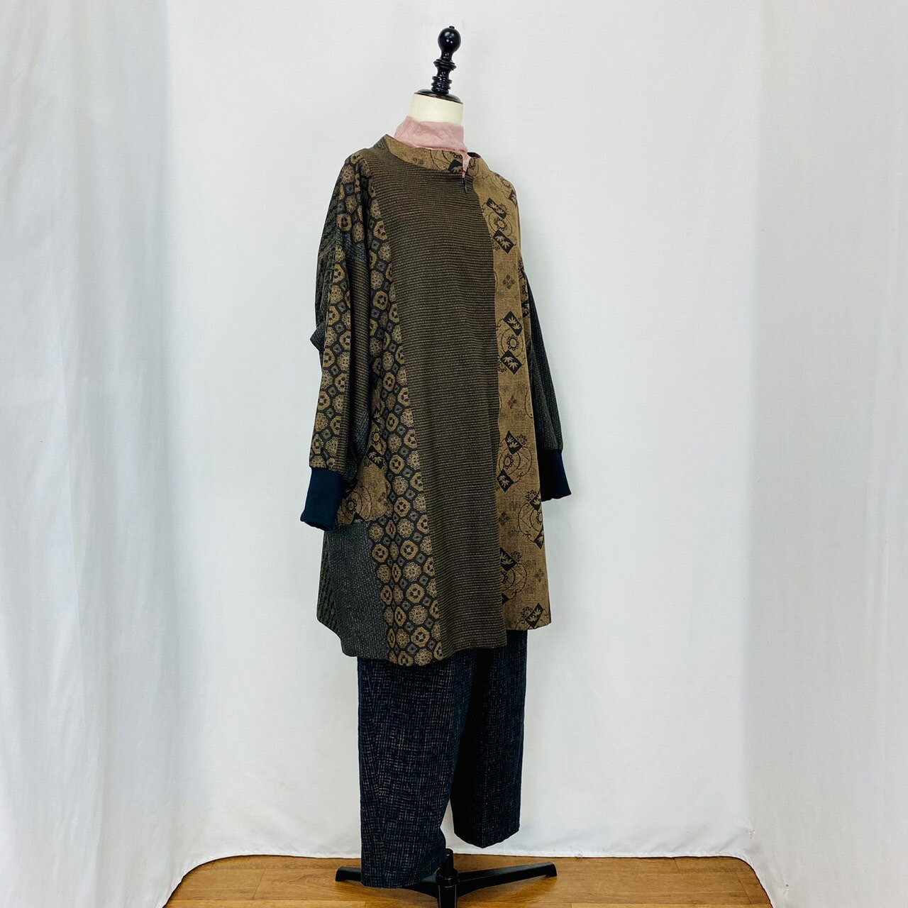 【商品紹介】大島紬柄の生地を使用した割烹着風チュニックです。