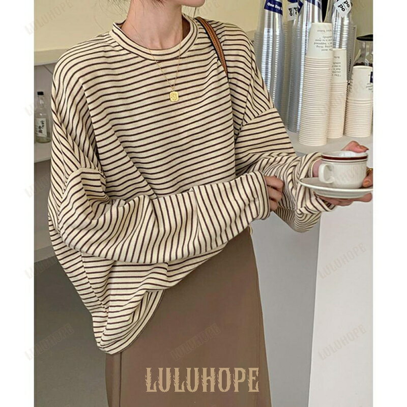 素材:ポリエステル100%カラー:ブラック/ブラウンサイズ:ワンサイズ着丈:約66cm 肩幅:約60cm 袖丈:約53cm ゆき:約83cm 身幅:約61cm 胸囲:約122cm裏地:なし伸縮性:なし透け感:なし生産国:中国ロングカットソー 着やせロンT ドロップショルダー 体型カバートップス クルーネック ゆったり 韓国プルオーバー 丸首抜け感のあるシルエット、細めのボーダー柄で大人のカジュアルスタイルにマッチするカットソードロップショルダーデザイン、リラクシーな着こなしを楽しむゆったりしたサイジングが嬉しいポイント1枚ではもちろん、インナーとしてカーディガンやジャケットなどのライトアウターと合わせて、ロングシーズン重宝するアイテム