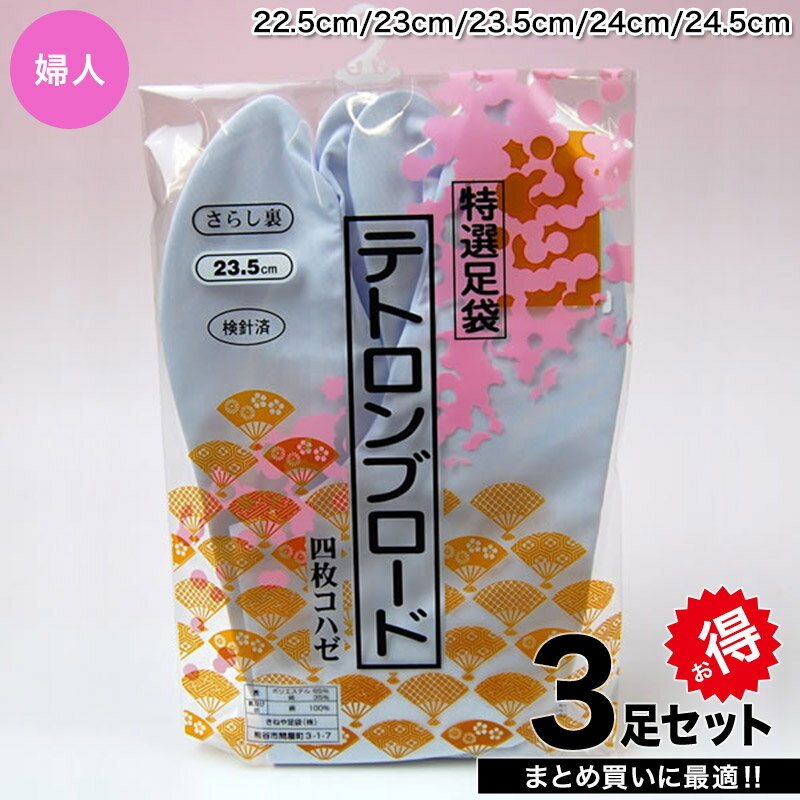 ◆きねや足袋 テトロンブロード 女性用足袋 4枚コハゼ 3足セットの紹介履きやすさで人気の足袋老舗メーカー「きねや」の白足袋です。