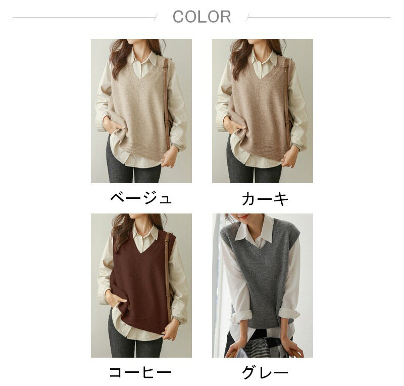 カラー カーキ/グレー/ベージュ/コーヒー 素材 アクリル、ポリエステル セット内容 ベスト 商品紹介 秋のレイヤードスタイルに欠かせないニットベストです。