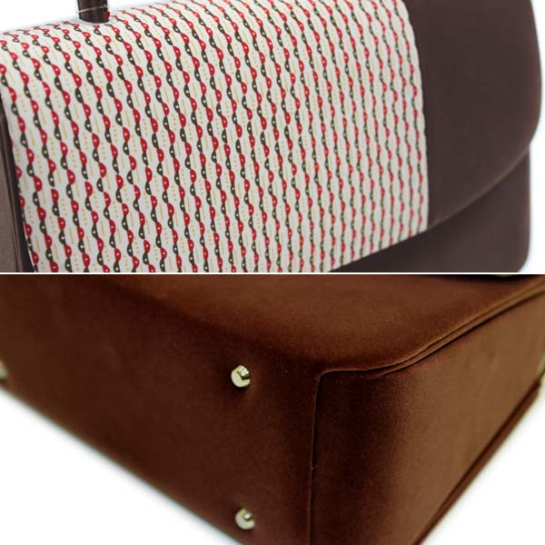 ブラウンのベロア生地と幾何学模様のコンビになったモダンなデザインのバッグです。