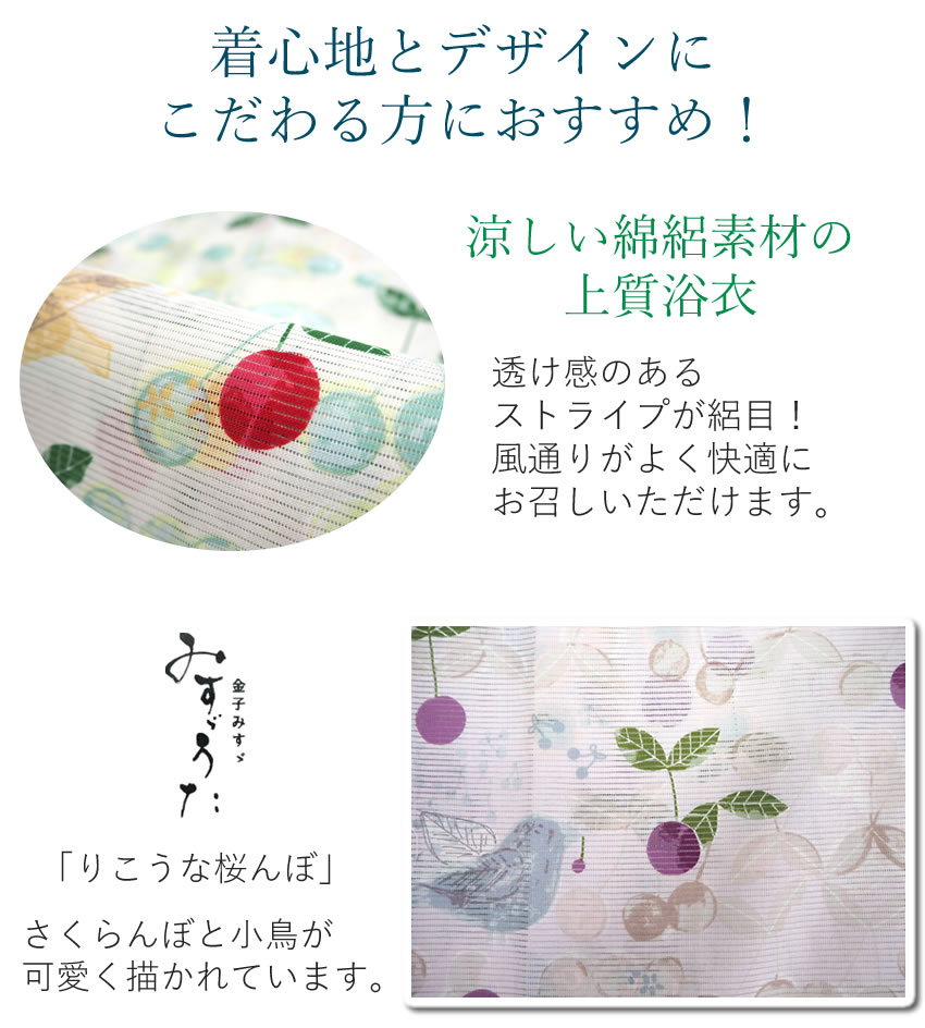色柄詳細 No.1 薄グリーンごくごく薄いグリーン地 No.2 薄ピンク紫薄いピンク紫地 金子みすずの「りこうな桜んぼ」をモチーフに可愛いサクランボと小鳥が描かれています。