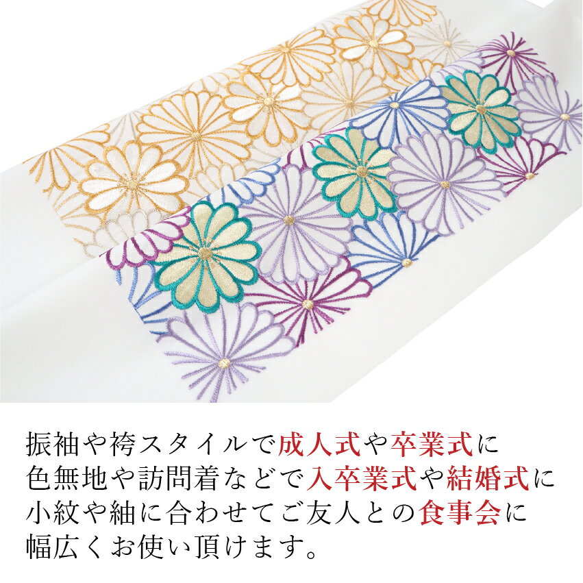 色柄 No.1 ゴールド・シルバー菊 No.2 紫・青緑系菊 相性ぴったりな着物! 振袖 二尺袖 訪問着 色無地 小紋 紬 お出掛け先 成人式、卒業式、結婚式、パーティー、ホテル、食事会、観劇などフォーマルからカジュアルまで 長所 正絹風のつややかな光沢となめらかな肌触り。