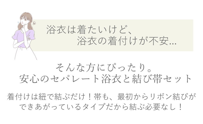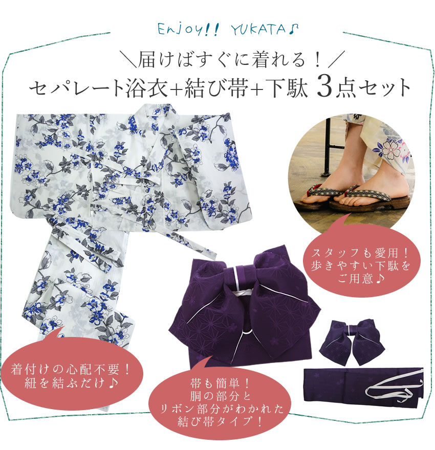 帯も結べるのかな? そんな心配はご不要! 紐で結んで、上下にわかれているセパレート浴衣と結び帯をセットにして着付けの不安を取りのぞきました! 花火大会・夏祭りをさらに楽しむために安心して浴衣を着よう! セット内容 お仕立て上り浴衣 二部式浴衣 結び帯(作り帯) 下駄