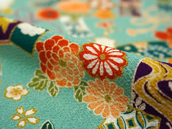 ■色柄詳細 ちりめん風のシボのある渋めの水色地に梅・菊・桜・紅葉などの四季の花と雪輪、そして色紙がデザインされています。