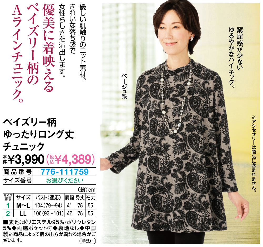 優美に着映えるペイズリー柄のAラインチュニック!優美に着映えるペイズリー柄のAラインチュニック!優しい肌触りのニット素材。