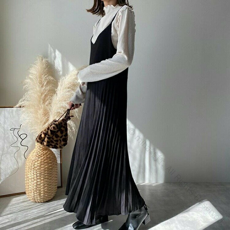 プリーツがふわっと広がる女性らしさ演出してくれる一枚!胸元はフラットで切替位置を高くにしているので脚長効果、スタイルアップも◎ふわっと広がるシルエット&ロング丈で、体型カバー効果も期待できます◎どんなトップスとも合わせやすく、オシャレなレイヤードスタイルが完成◎秋はロンTや冬はタートルなどと合わせ中をスッキリさせるとスタイルアップ!キャミワンピースは1枚持っておくといろんな時期に着れるので便利♪素材:95%ポリエステル★サイズ(cm): M 着丈115 バスト80; L 着丈116 バスト84; XL 着丈117 バスト88;