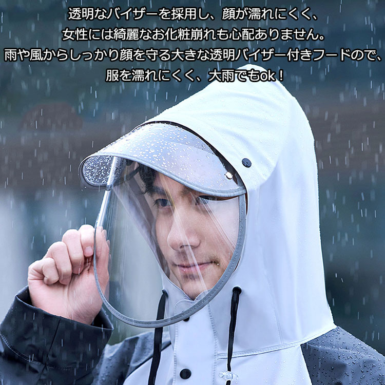 左右のポケットは実用性を高め、着脱可能なレインバイザーは視界を確保しながら顔を濡らさずに済みます。