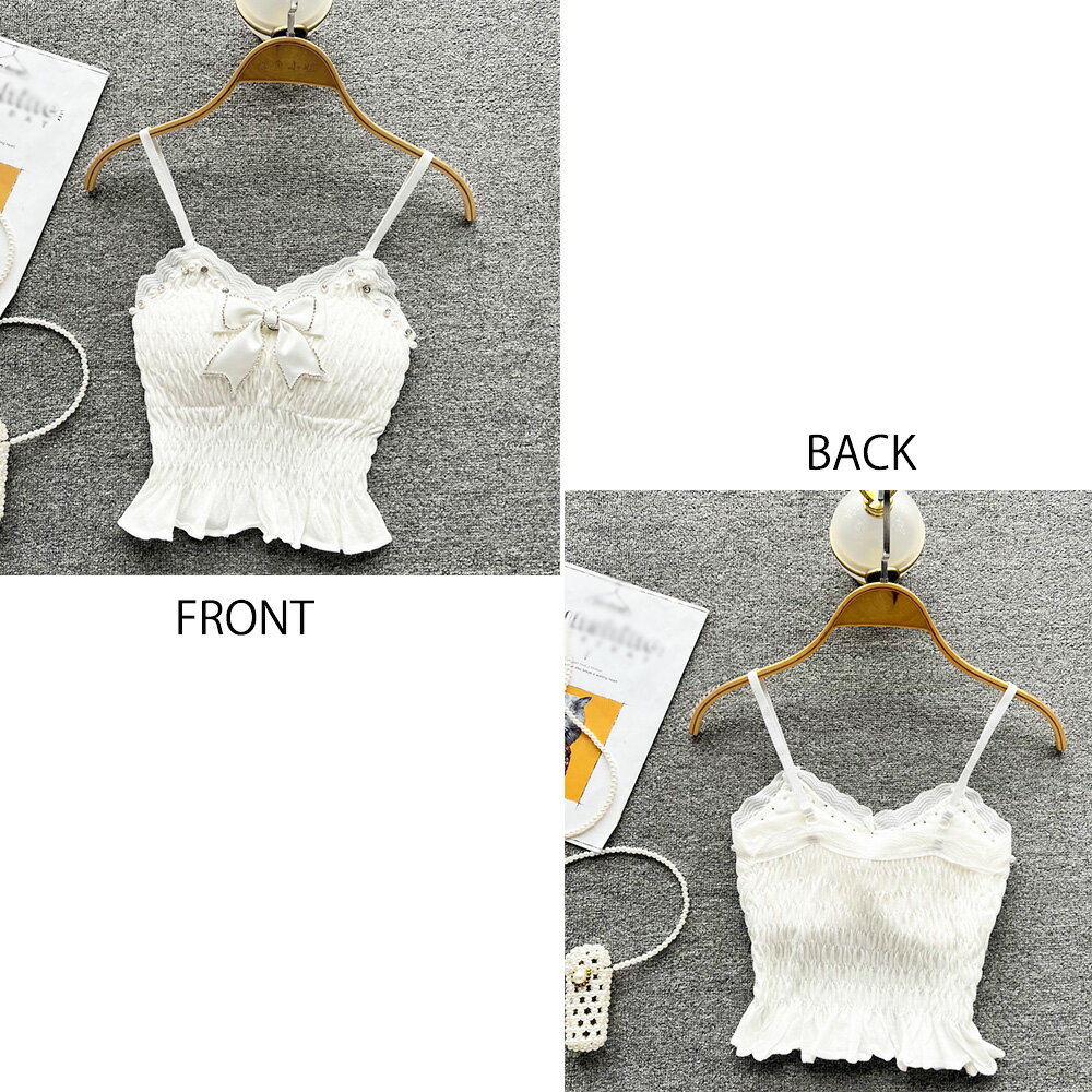 ■商品の特徴インナー トップス シャーリング カップインキャミ レディース ギャザー ショルダーストラップ リボン付き お洒落フェイクパールときらきら輝くラインストーンをあしらったリボン付きキャミソールです 伸縮性が良く柔らかい素材で、ボディに程よくフィットするサイズ感が着用しやすいです インナー使いはもちろん、1枚でも決まるアイテムです