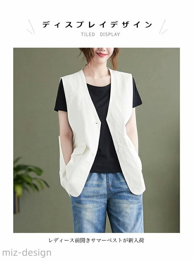 ■レイヤードコーデのマストアイテム レディースサマーベスト レディース前開きサマーベストが新入荷 夏シーズンに必ず大活躍、コーデのアクセントになることは間違いなし シンプルトップスの上に重ね着するだけでコーデ完成 レイヤード感をプラスして、シャツやカットソーを着る時期に重宝 実用性とファッション性兼ね備え、大きめスクエアポケットが付いてるのも嬉しい 流行に左右されず長く愛用でき、チラリと個性を出します いつものコーデをワンランク上、サラッと印象を変えるマストアイテム コーデに馴染みやすい、落ち着いたカラバリを用意