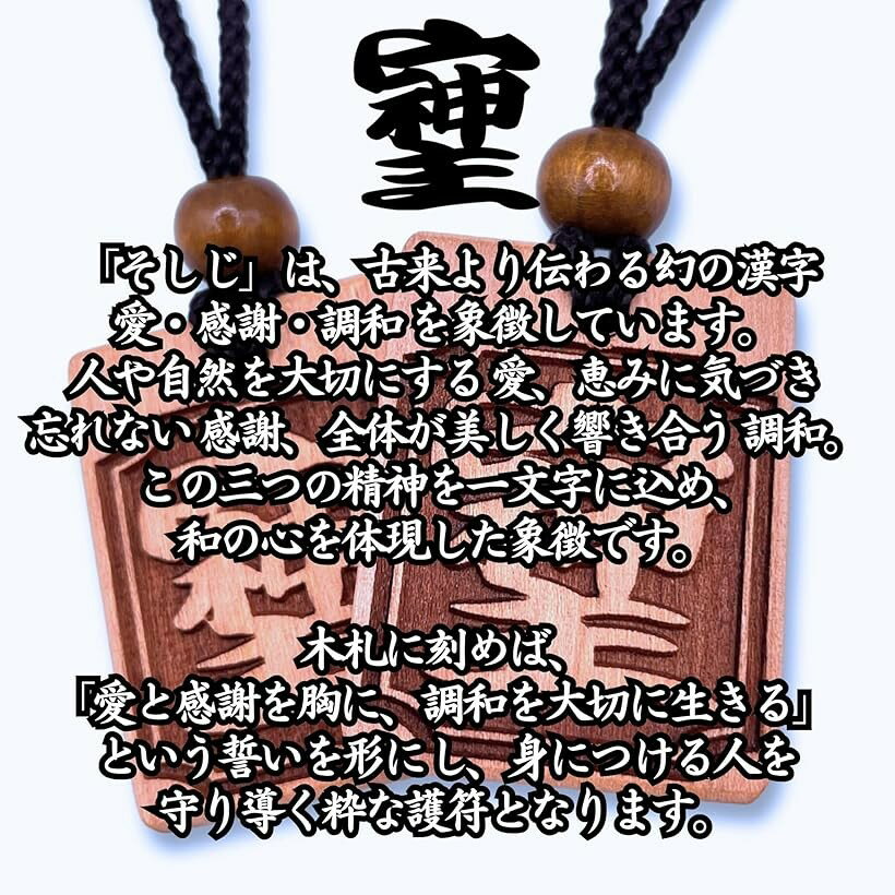 「そしじ」の文字を胸元に刻むことで、愛を忘れず、感謝を大切にし、周囲との調和を保つ――そんな日々を後押しするお守りとしてお使いいただけます。