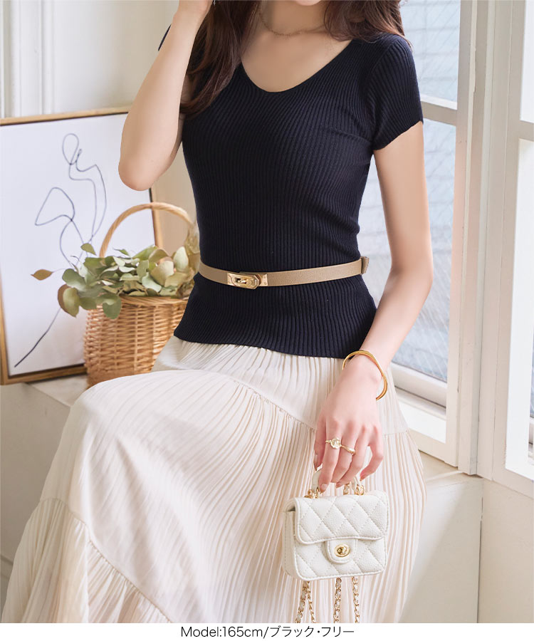 デコルテを美しく魅せるネックラインに、程よくフィットするリブトップスが上品な雰囲気を演出します。