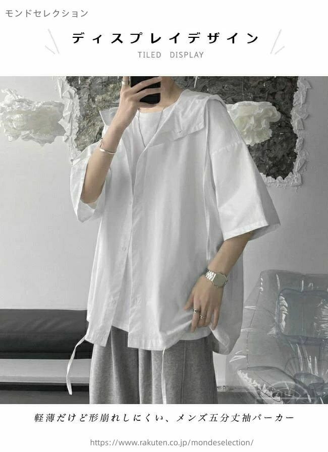 ■軽薄で形崩れしにくい生地感、メンズ五分丈袖パーカー 軽薄だけど形崩れしにくい、メンズ五分丈袖パーカー 通気性に優れ、サラサラの生地感で快適な着心地 ラフなオーバーサイズ設計なので、体型選ばずに着用できます Tシャツなどの上に羽織るだけでおしゃれ度アップ シンプルでカジュアルなデザインは様々なコーデになじみやすい クールなブラック・清潔感のホワイト・落ち着いたグレー 男性が着やすい、定番の3色が用意されました 長袖トップスとも重ね着でき、ロングシーズンで活躍できます 。