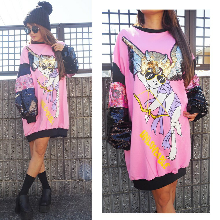 Pick Up Check スパンコール×デビルプリントで超ド級のハデハデトレーナーが登場♪袖はブラックスパンコール×和柄になっていて、個性派さんにはたまらないオリジナリティ溢れるデザインで街の視線独り占め☆長めの丈なので、1枚で着たり、さらに派手なレギンスなどと合わせてぶっとんだスタイルを楽しんでも◎!ゆったり大きめな作りなので、動きやすく、着心地も楽ちんなので、普段着にはもちろん、ダンス衣装やイベント用にも活躍する事間違いなし♪人とかぶりたくない!!そんなオシャレっ子さんにオススメ☆ Stretch あり Color ピンク Fabric ポリエステル65%、綿35% Size