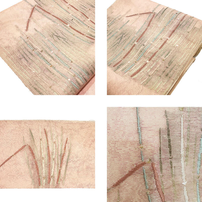 ・・・・・・・・・・・・・・・・・・・・・・・・・・・・・・・・・・・・・・・・・・・・・・・・・・ もじり織りが基本の 夏の絽名古屋帯 ローズぼかしの引箔を背に 銀と色糸の木賊(とくさ) まだらぼかしのローズ地 涼やかな夏の文様 ちょっと珍しい木賊(とくさ)に 二色の引箔が見事 ひとつしかない あなただけの逸品 付下・無地・小紋など たいへん幅広くお使いいただけます。