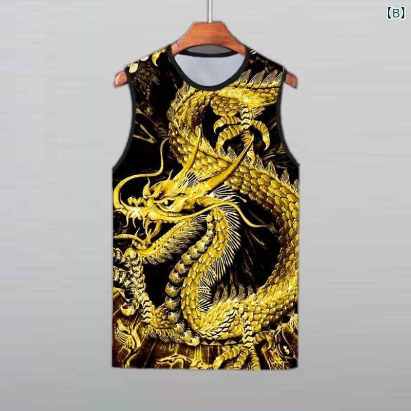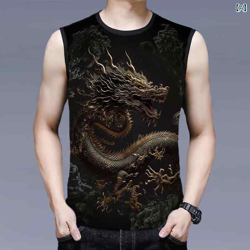 タンクトップ 夏 メンズ 中国風 ドラゴン プリント ノースリーブ トップス 大きいサイズ ゆったり 薄手 カジュアル スポーツ 普段使い ポリエステル ラウンドネック 黒 ゴールド 白