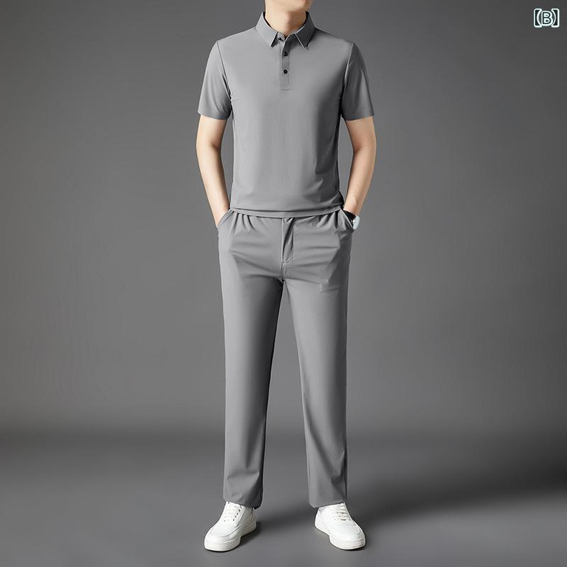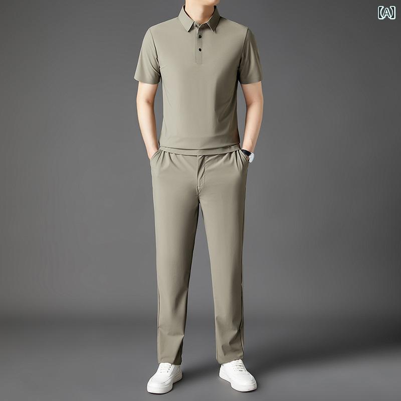 ・カテゴリ: メンズカジュアルセットアップ・スタイル: ビジネスカジュアル・厚み: 薄手・丈: フルレングスパンツ・上衣スタイル: Tシャツ・上衣袖丈: 半袖・主な素材: シルク100%・用途: カジュアル・カラー展開: カーキ、グレー、ダークネイビー、ブラック・サイズ展開: M、L、XL、XXL、XXXL、XXXXL