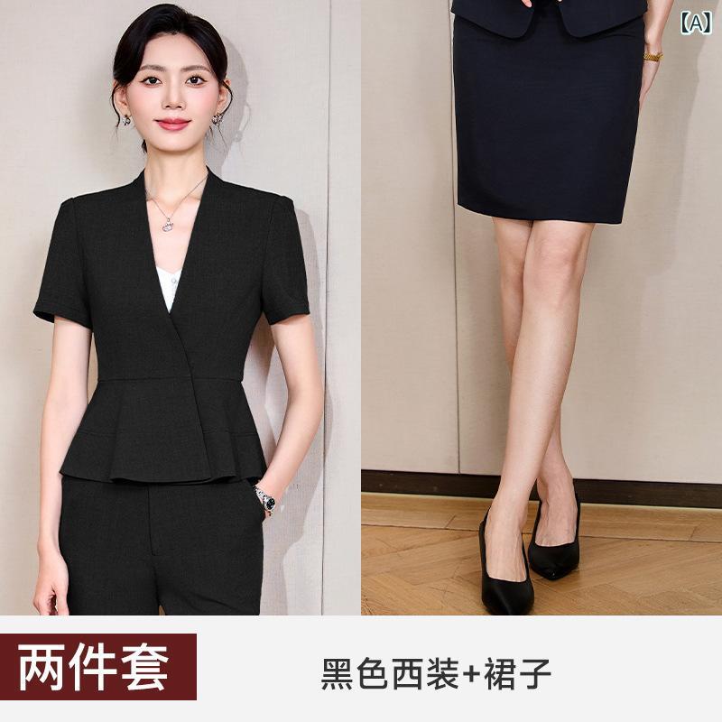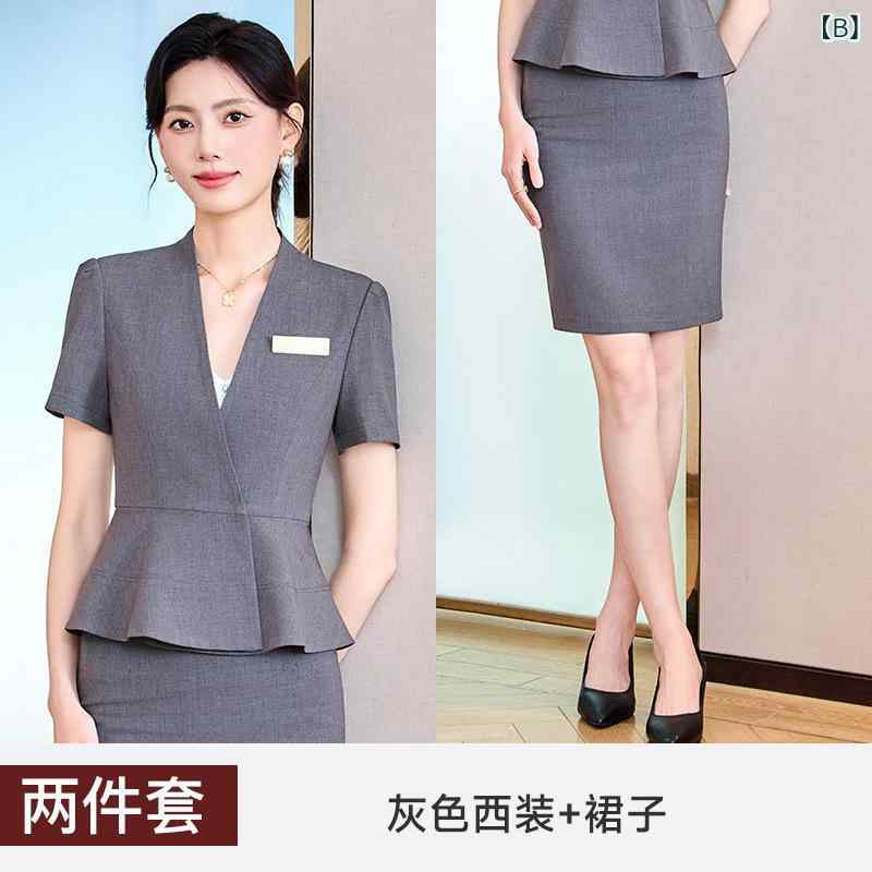 2個セット・カテゴリ: セットアップ・スタイル: OL通勤・主な素材: ポリエステル70~80%未満、ビスコース繊維30%以下・カラー展開: ブラック、グレー、ブルー、アプリコット・サイズ展開: S、M、L、XL、XXL、XXXL、XXXXL・スカート丈: ミディ丈・袖タイプ: レギュラー袖・袖丈: 五分袖