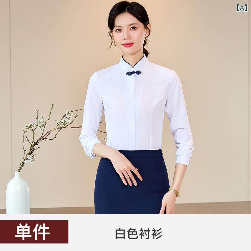 ・カテゴリ: シャツ・スタイル: エレガント通勤、アーバン、スウィートカジュアル・主な素材: 竹繊維、ポリエステル 90〜95%、スパンデックス 30%以下・柄: 無地・フィット: レギュラー・着丈: 普通丈(50cm超〜65cm以下)・ネックライン: スタンドカラー・袖丈: 長袖・袖タイプ: レギュラー袖・前立て: シングルブレスト多ボタン・特徴: ボタン・加工: ギャザー・カラー展開: ホワイト、ロイヤルブルー・サイズ展開: S、M、L、XL、2XL、3XL、4XL