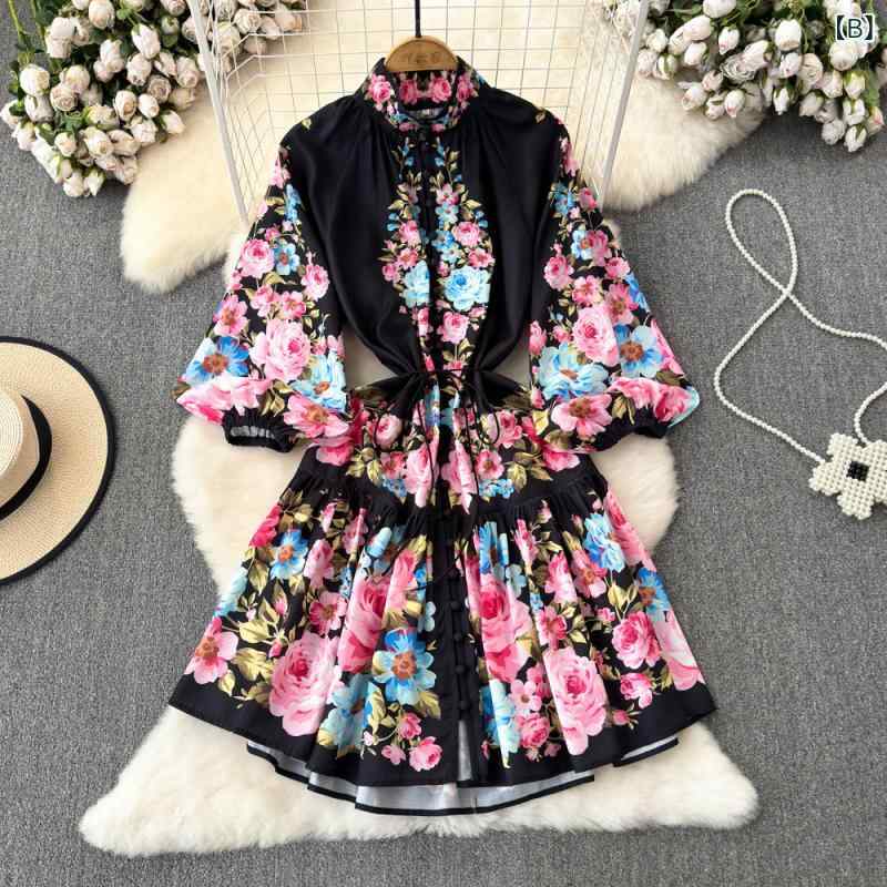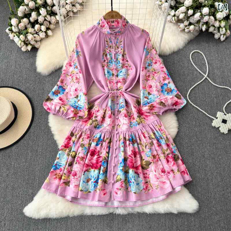 ・カテゴリ: ワンピース・スタイル: レトロ、チャイナ風・シルエット: Aライン・主な素材: ポリエステル・ネックライン: クルーネック・袖丈: 長袖・袖タイプ: ランタンスリーブ・ウエスト: ミドルウエスト・スカート丈: ミディ丈・柄: 小花柄・形式: 単品・カラー展開: ピンク、ブラック、ホワイト・サイズ展開: S、M、L、XL、XXL