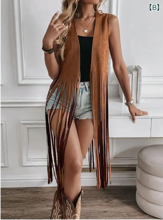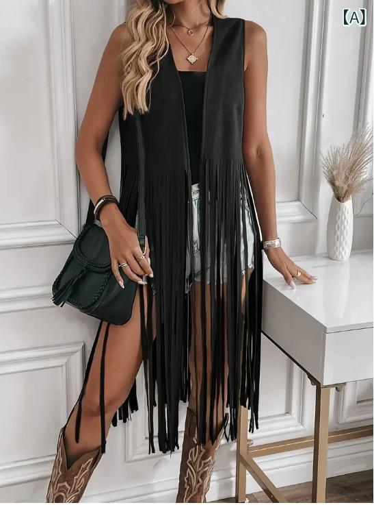2個セット・カテゴリ: ベスト/ジレ・スタイル: オープンフロント、レトロエレガント・主な素材: スエード調(混率90-95%)・着丈: 100cm以上・ネックライン: ハーフオープンカラー・デザイン: フリンジ・留め具: ボタンなし・フィット感: ルーズフィット・対象年齢: 成人・性別: レディース・カラー展開: ブラック、ブラウン・サイズ展開: S、M、L、XL、XXL