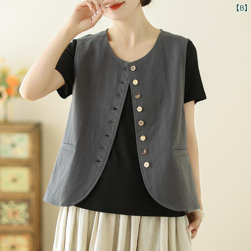 ・カテゴリ: ベスト、ジレ・スタイル: レトロカジュアル・主な素材: ポリエステル50〜70%、綿30〜50%・ネックライン: ホルターネック・デザイン要素: ポケット、ボタン・着丈: 普通丈・前開き: シングルボタン・サイズ展開: M、L、XL、2XL・カラー展開: カーキ、グレー・対象性別: 女性・対象年齢層: 成人・フィット: レギュラー