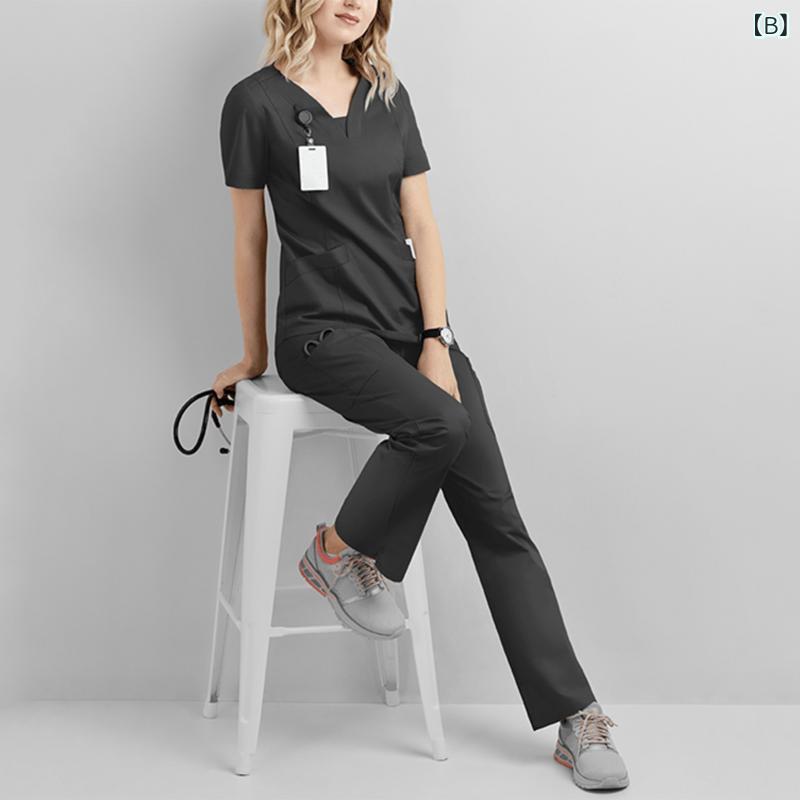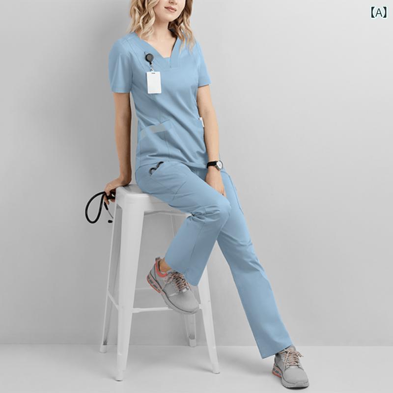 ・用途: 作業着・性別: 女性・カテゴリ: 服装・機能: 吸湿速乾・パンツ丈: ロング・生地: 四方向ストレッチ・主な素材: ポリエステル95%、スパンデックス5%・カラー展開: グレー、ブラック、グリーン、ブルー、レッド、ホワイト、ライトブルー・サイズ展開: S、M、L、XL、XXL、XXXL・袖タイプ: 連結袖・袖丈: 半袖・ネックライン: Vネック・着丈: 普通丈
