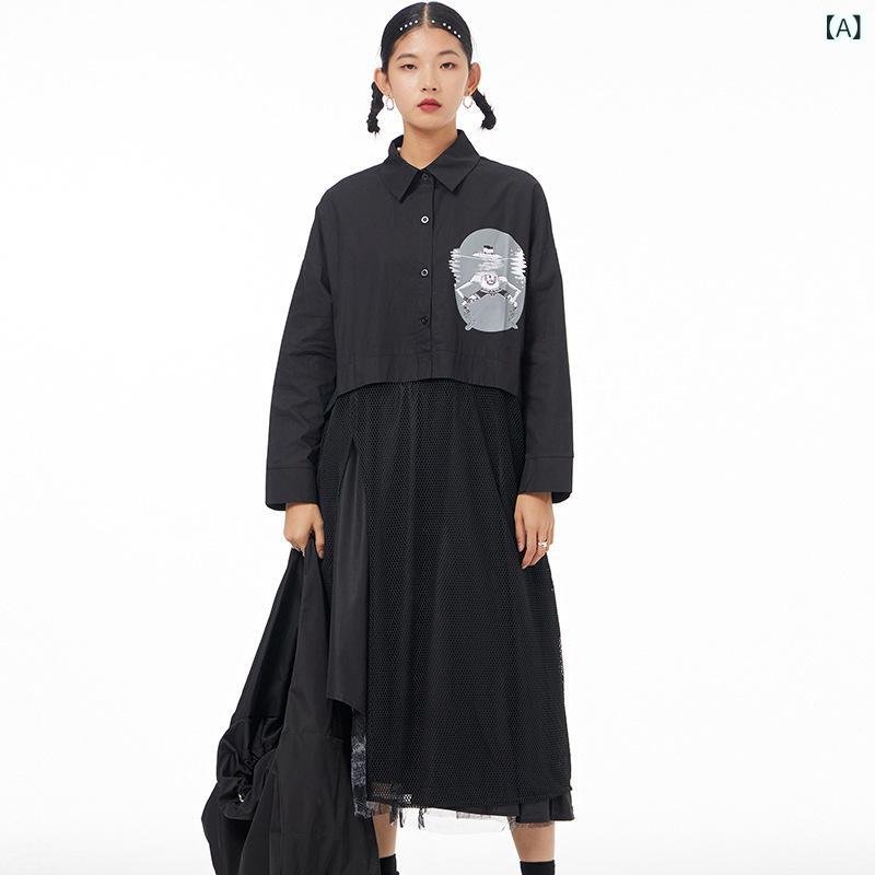 ・カテゴリ: トップス ・スタイル: ストリートカジュアル ・主な素材: 綿、ポリエステル ・ネックライン: 襟付き ・柄: カートゥーン ・デザイン: メッシュ、パッチワーク、シャツ生地切替 ・カラー展開: ブラック ・サイズ展開: フリーサイズ ・性別: レディース