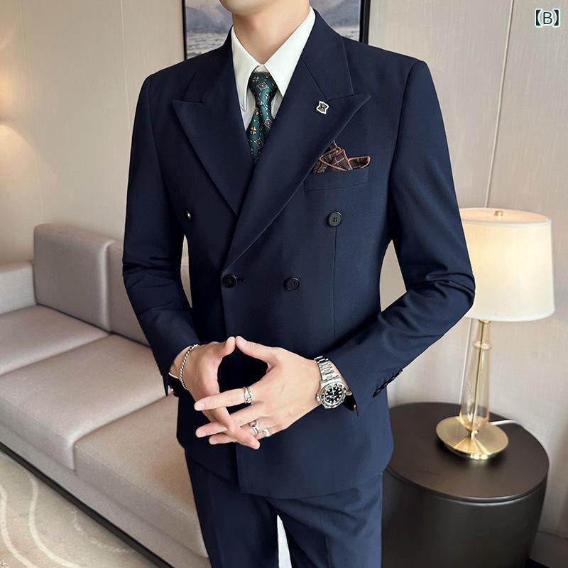 ・スタイル: ビジネスカジュアル・主な素材: アセテート繊維68%ブレンド・シルエット: スリムフィット・厚さ: 薄手・襟型: ピークドラペル・前立て: ダブルブレスト2つボタン・ベント: サイドベンツ・デザイン: ボタン装飾・加工: 接着芯地・シーン: カジュアル・カラー展開: ブラック、ロイヤルブルー、ダークグレー、ミディアムグレー、ライトグレー・サイズ展開: S、M、L、XL、XXL、3XL、4XL、5XL、6XL、7XL