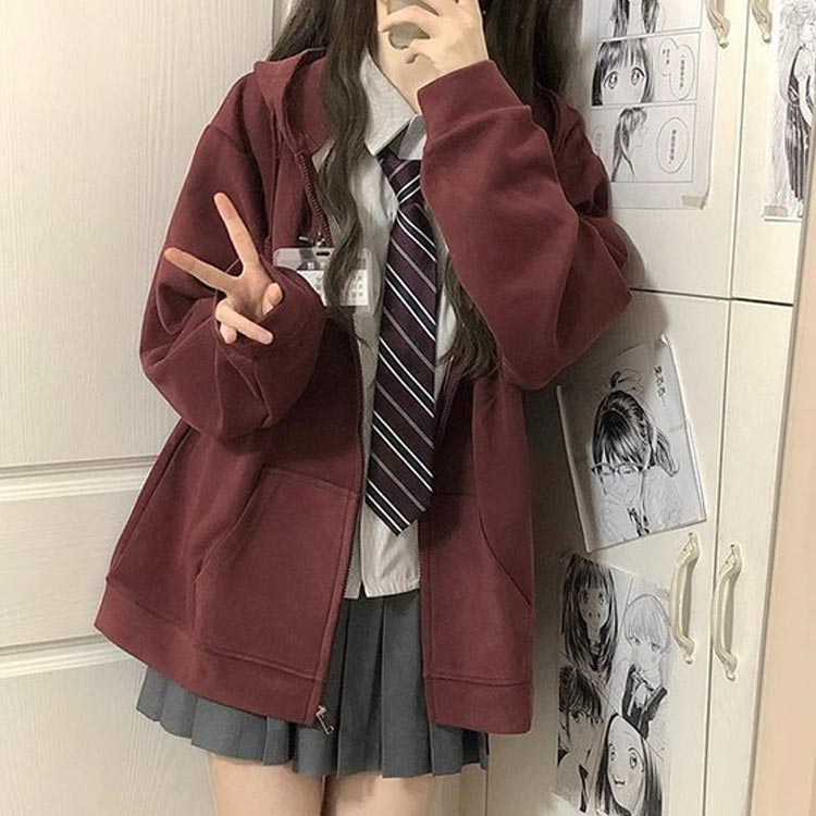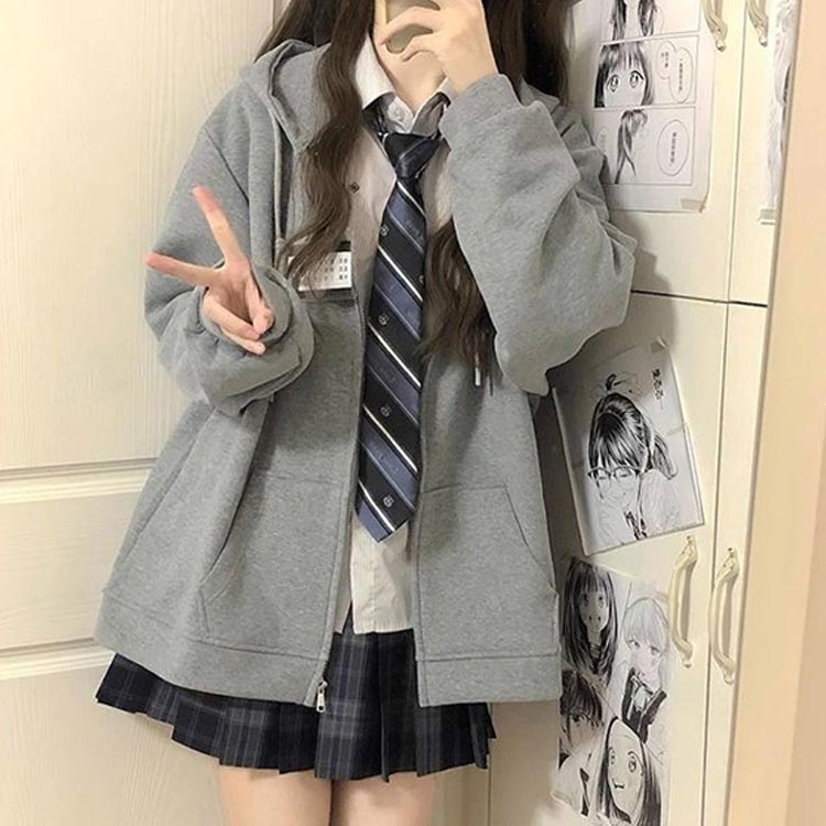 通学カジュアルコーデに欠かせないシンプルなジップパーカーです。