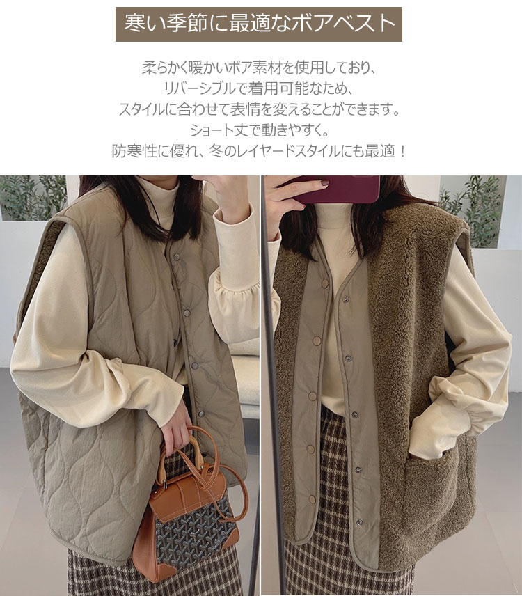 ※お品物の色合いは、写真撮影、パソコン画面表示等の環境の違いにより、若干異なる場合がございますので予めご了承くださこのベストは、柔らかく暖かいボア素材を使用しており、 リバーシブルで着用可能なため、 スタイルに合わせて表情を変えることができます。