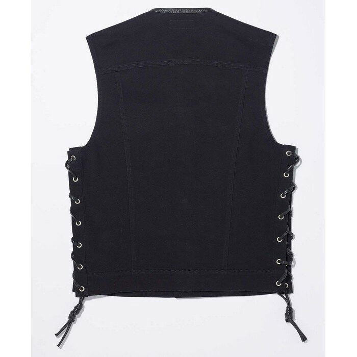 従来のデニムベストのサイド編上げを踏襲、ライダースをはじめとする様々なジャケットとの重ね着が可能です。