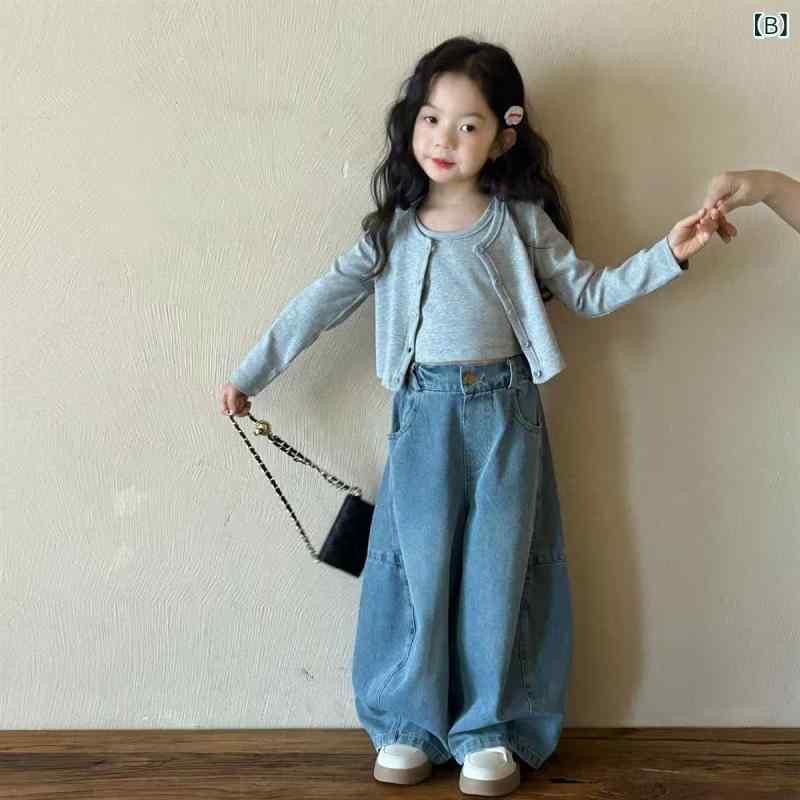 ・カテゴリ: キッズセットアップ・スタイル: 韓国カジュアル・性別: 女性・タイプ: パンツセットアップ・セット内容: 2点セット・対象年齢: 8歳以上、身長140cm以上・主な素材: デニム、綿71%〜80%・袖丈: 長袖・パンツ丈: ロング・開閉: シングルボタン・生地加工: 柔軟処理・厚さ: 普通・カラー展開: グレー、デニム・サイズ展開: 90cm、100cm、110cm、120cm、130cm、140cm