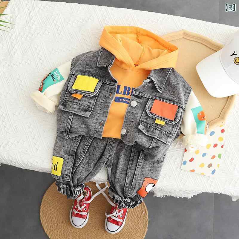 ・カテゴリ: キッズセットアップ・性別: 男児用・対象年齢: 1〜3歳・推奨身長: 80〜100cm・スタイル: 韓国風、トレンド・デザイン: フード付き、可愛らしい・柄: ロゴ・袖丈: 長袖・パンツ丈: 長ズボン・主な素材: 綿90%・生地加工: 柔軟加工・生地の厚さ: 普通・セット種類: パンツスーツ・セット内容: 3点セット・開閉タイプ: シングルボタン・仕様: 股下開閉式・カラー展開: ブルー、グレー・サイズ展開: 80cm、90cm、100cm、110cm、120cm