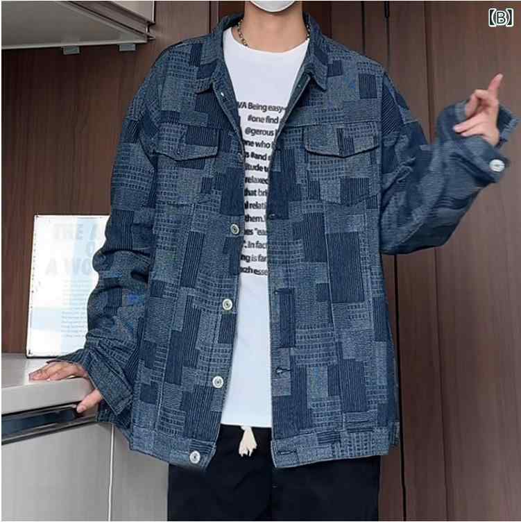 ・カテゴリ: ジャケット・スタイル: ユニセックス・対象層: 若年層・ネックライン: 襟付き・フィット: レギュラーフィット・前開き: シングルボタン・厚さ: 普通・柄: チェック・主な素材: デニム (コットン65%)・着用シーン: カジュアル・ディテール: ジャカード織り・加工: ウォッシュ加工・着丈: レギュラー丈・着用スタイル: アウター・袖丈: 長袖・カラー展開: ブラック、ブルー・サイズ展開: M、L、XL、2XL、3XL、4XL、5XL・性別: メンズ