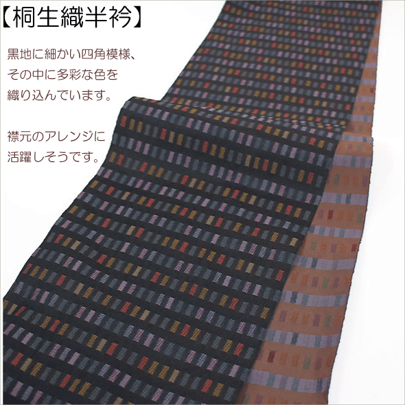 【四角模様】黒地に多彩で細かな四角模様はとても使い勝手がよさそうです衿元に気軽に変化がつけられる半衿で着こなしの幅がさらに広がります。