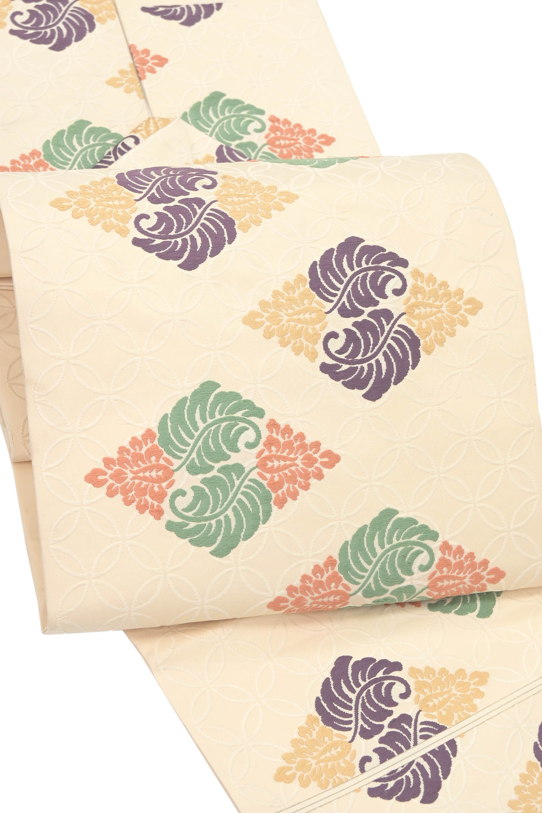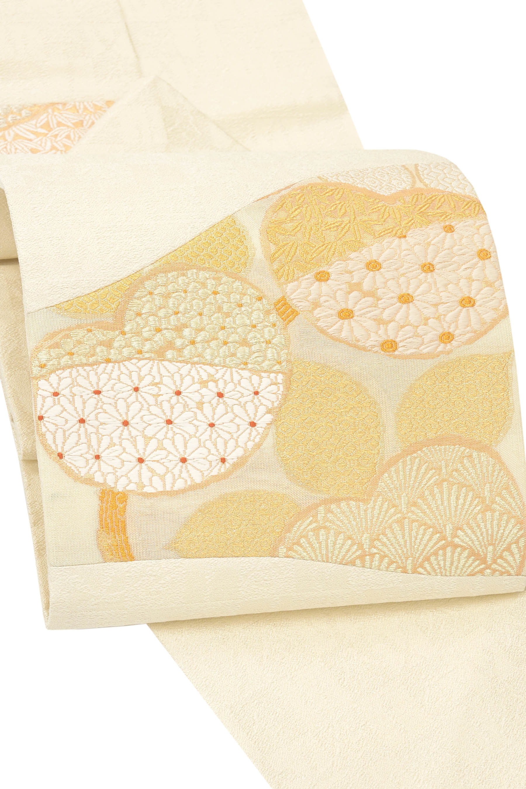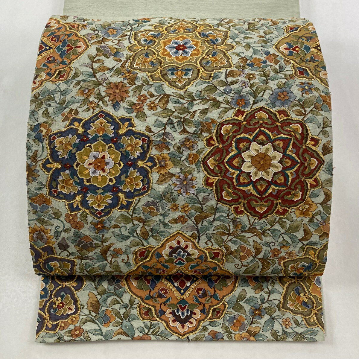 <名古屋帯サイズ>(単位:cm) 太鼓部分長さ 116 太鼓部分幅 29 前部分長さ 243 前部分幅 15 状態 よい 素材 正絹 色目 ごく淡い抹茶 技法 相良刺繍