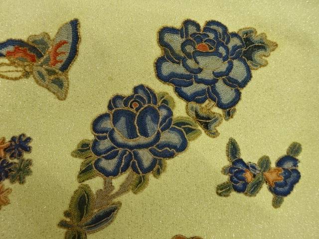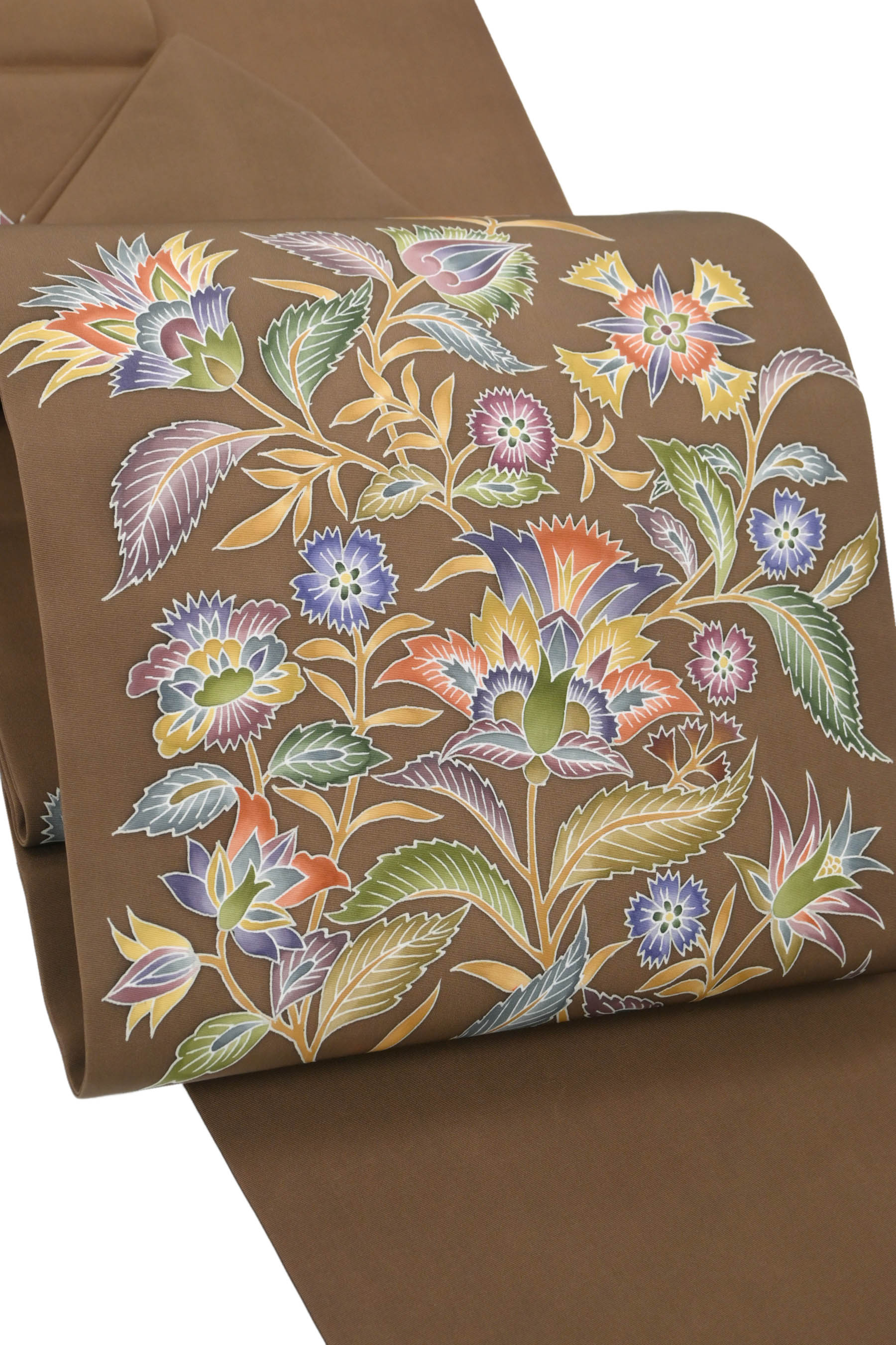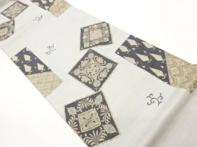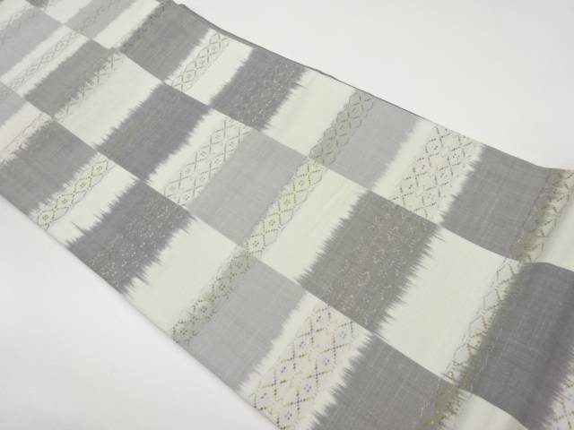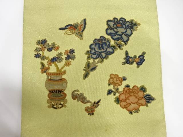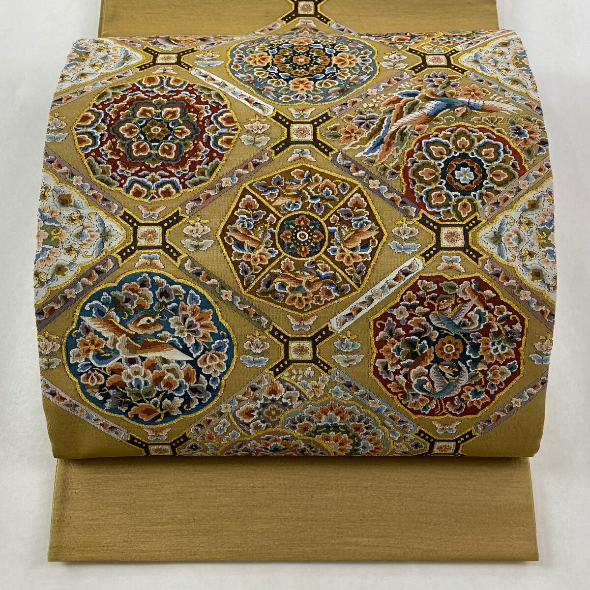 <名古屋帯サイズ>(単位:cm) 太鼓部分長さ 116 太鼓部分幅 29 前部分長さ 243 前部分幅 15 状態 よい 素材 正絹 色目 ごく淡い抹茶 技法 相良刺繍